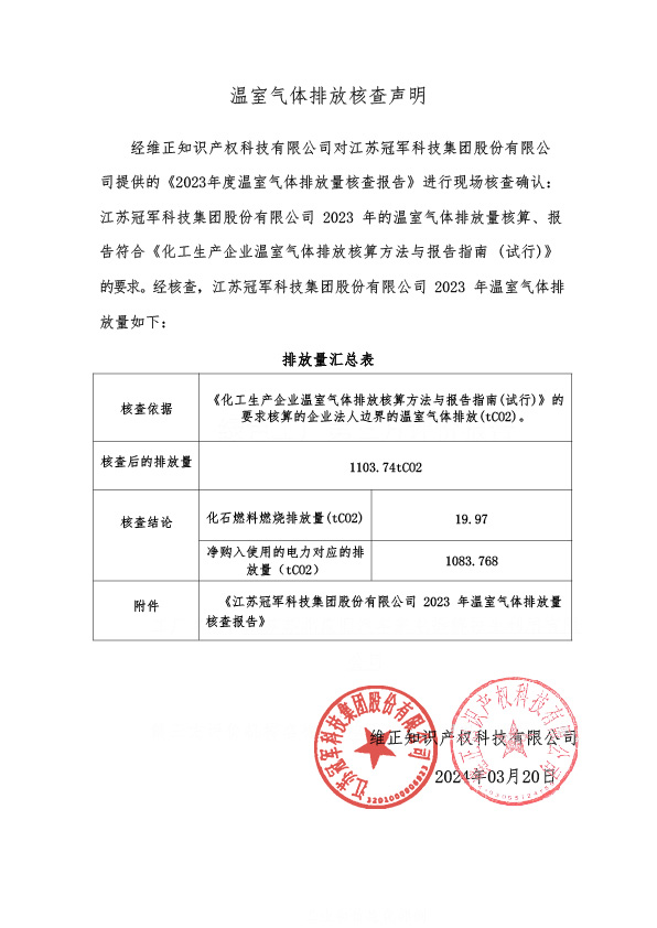 江蘇冠軍科技集團股份有限公司 產品碳足跡核查報告
